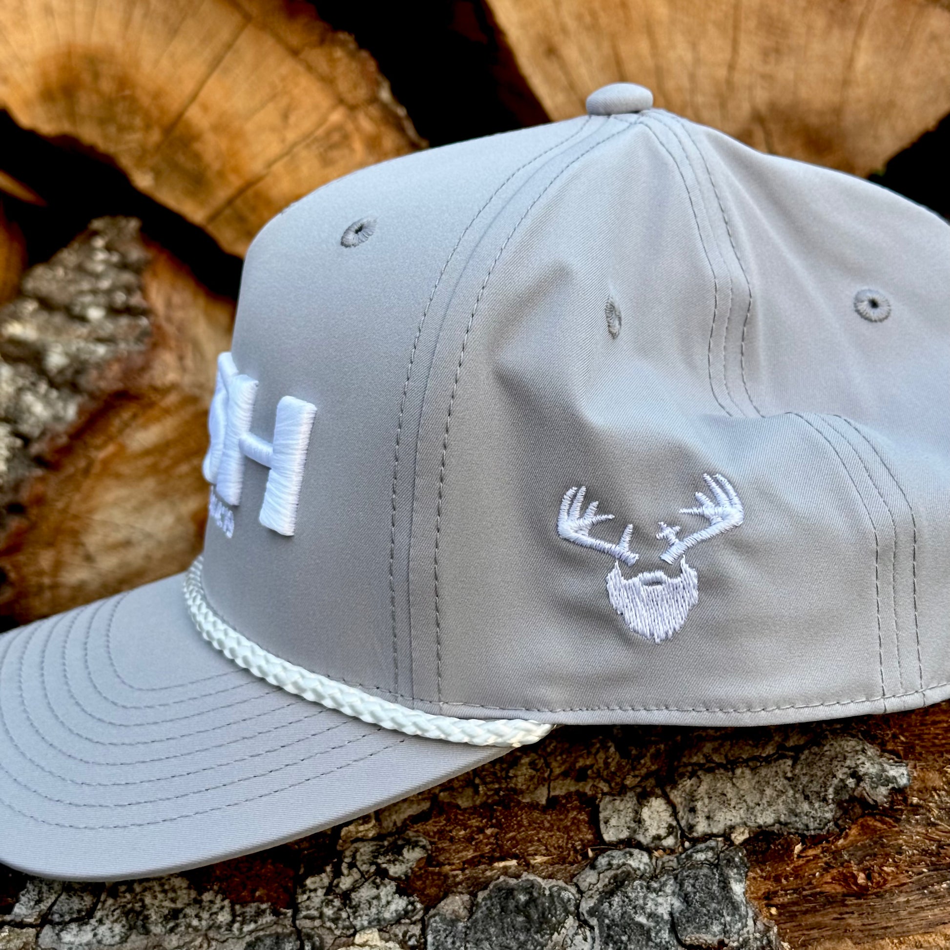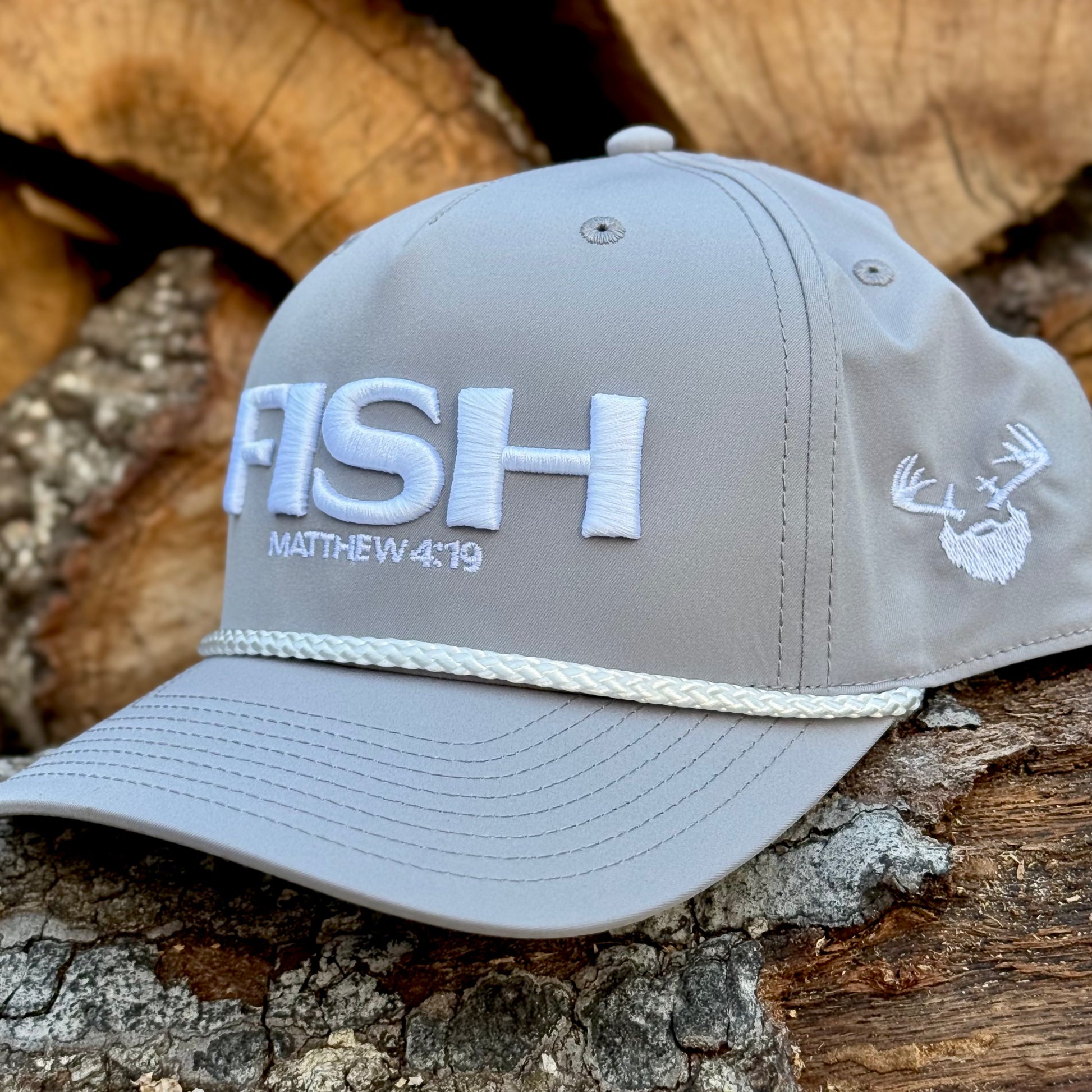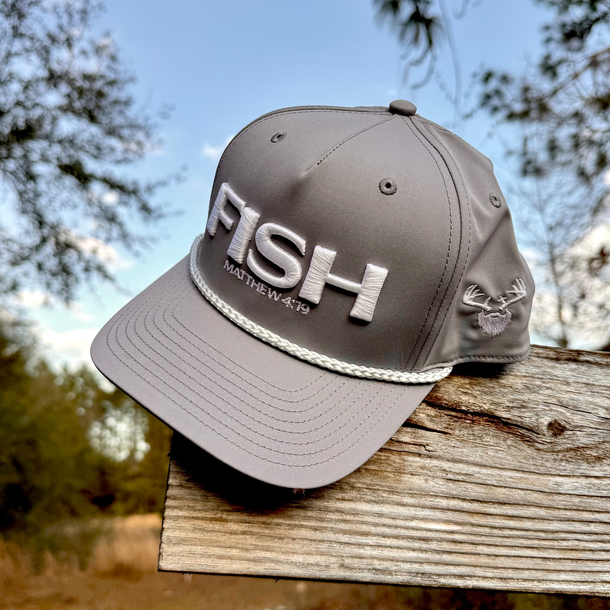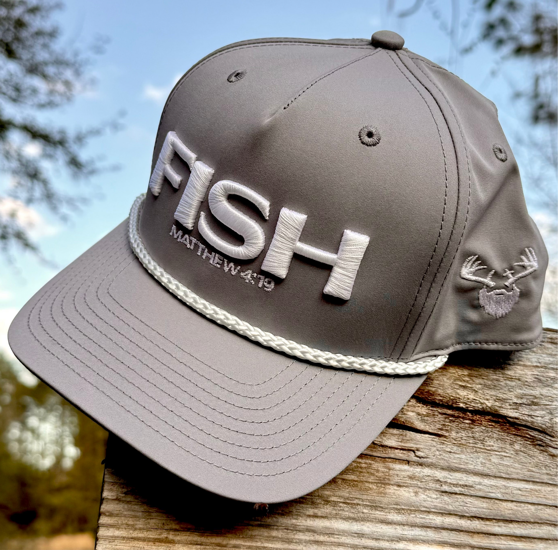 The FISH Hat is a Richardson 258 and is a snapback (one size fits all) hat made from 100% polyester. The grey polyester, white puff stitching, and white rope give it a trendy and stylish look. Perfect for any outdoor activity, this hat offers both comfort and durability.