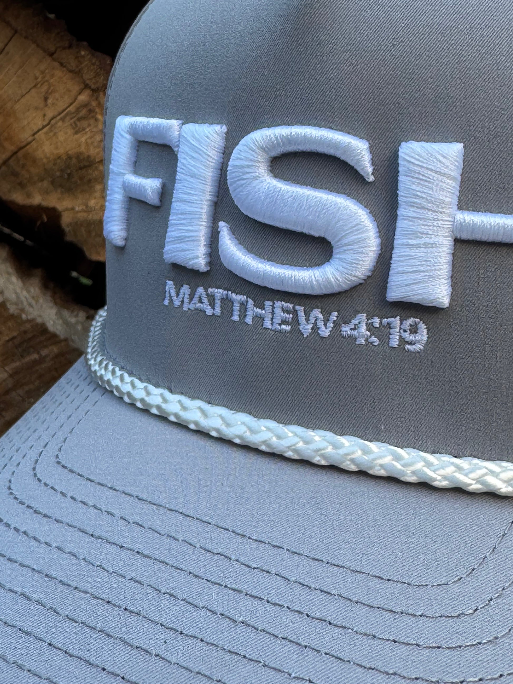 Introducing your new favorite fishing hat: the "FISH" hat! Make a statement and show your love for fishing while proudly wearing the bible verse Matthew 4:19. With a stylish design and meaningful message, this hat is the perfect addition to any fishing trip.