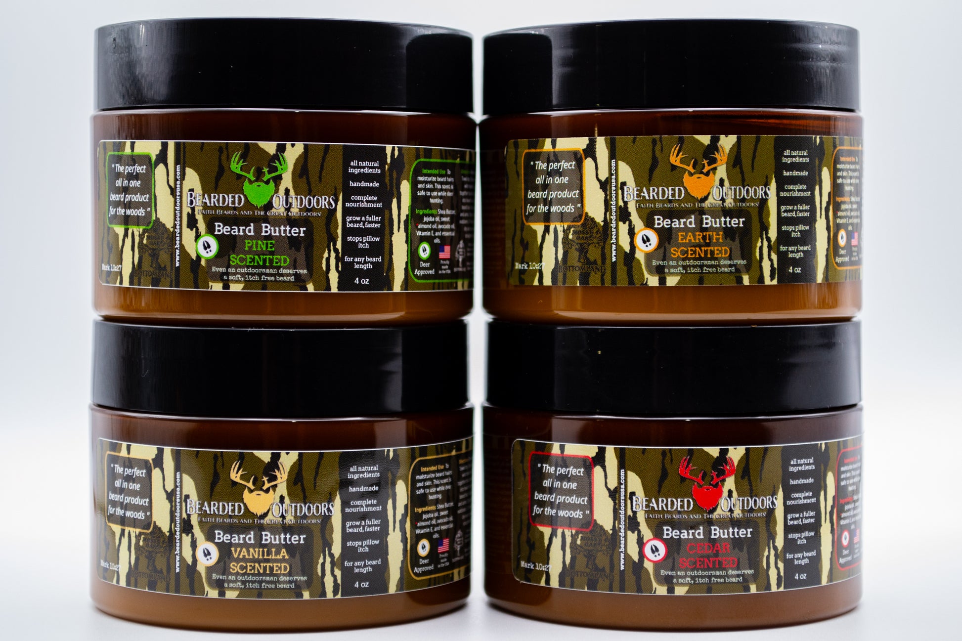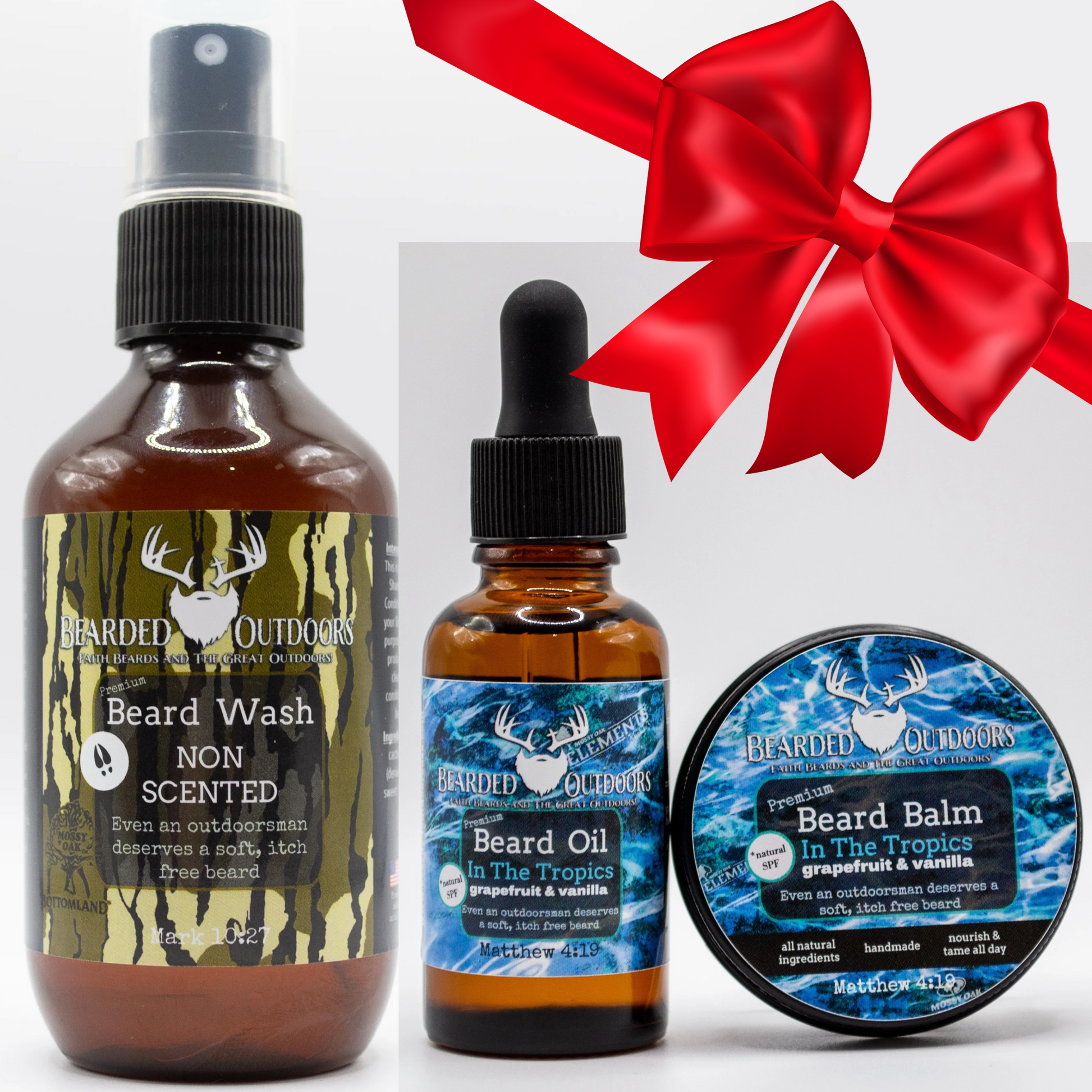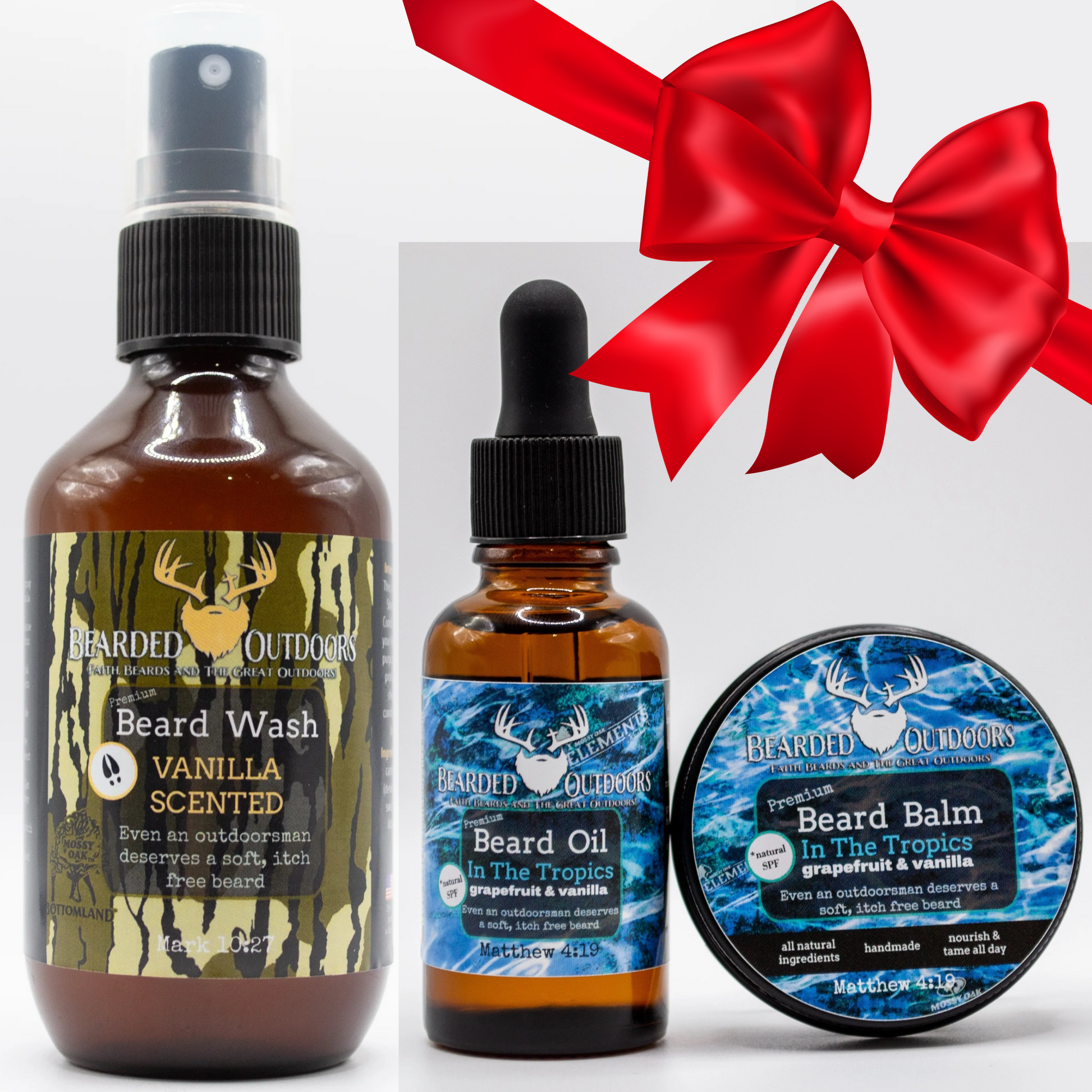 The outdoor product you have been waiting for! Introducing the all new Mossy Oak wrapped Beard Products! It only made sense to wrap your favorite beard products with your favorite camo patterns: Mossy Oak Bottomland and Mossy Oak Elements Agua